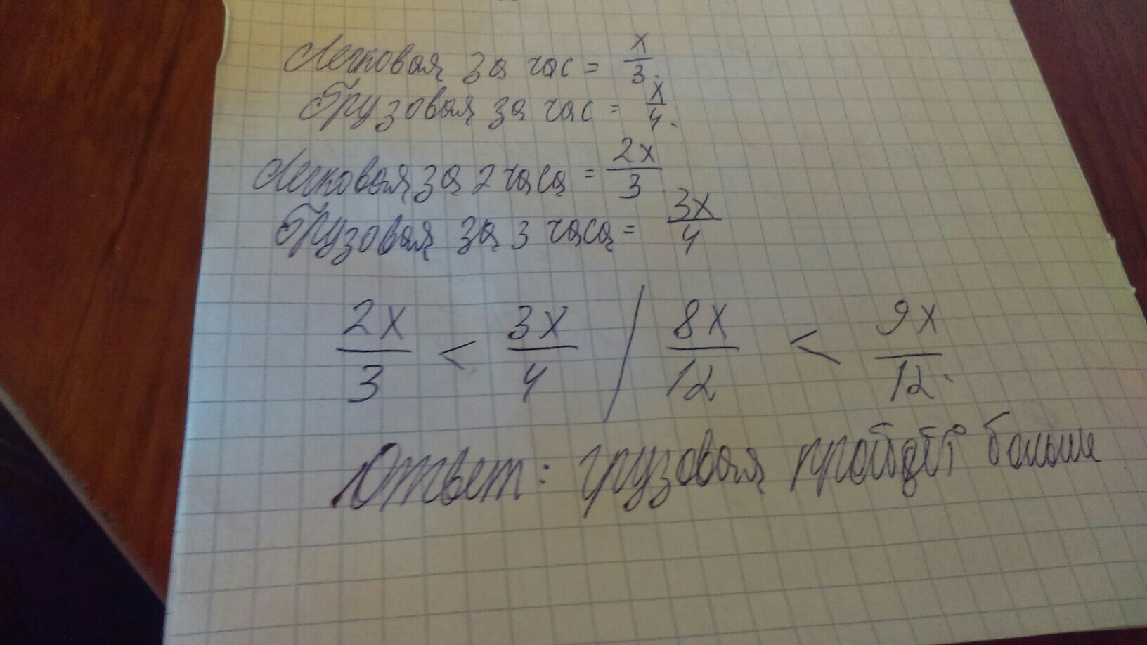 Расстояние от A до B легковая машина проходит за 3 часа, а грузовая за 4 часа. Какая машина пройдет больший путь-легковая за 2 часа или грузовая за 3 часа?