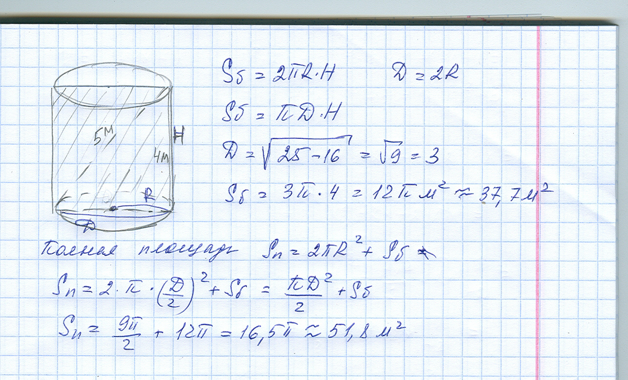 Диаглналь поперечного сечения оси цилиндра равна 5 метров, высотой 4 метра.Найдите площадь боковых поверхностей цилиндра.