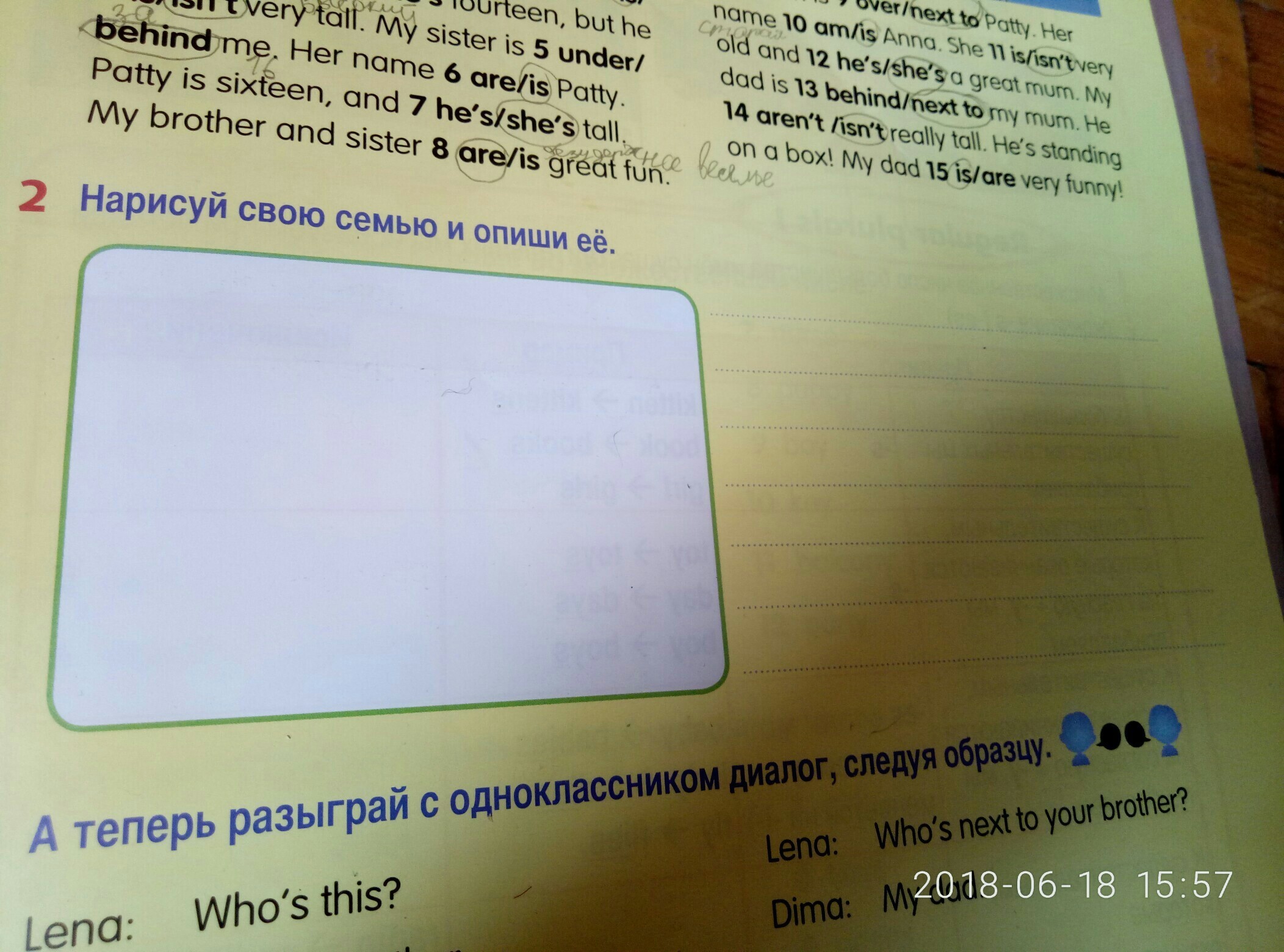 нарисуй свою семью (мама папа ты, если есть члены семьи ещё, то и их) и опиши на русском, потом забей в переводчике на англ))
