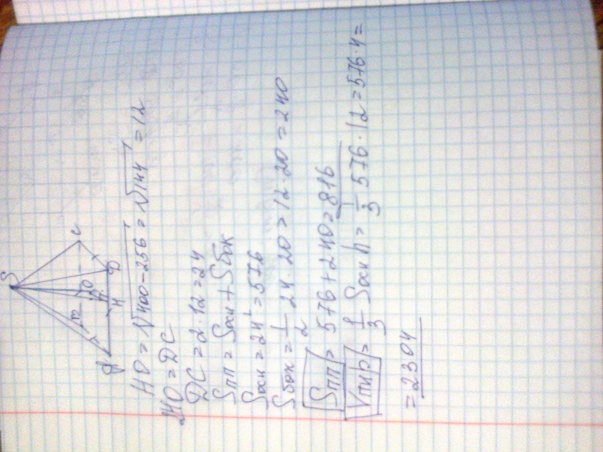 Высота правильной четырехугольной пирамиды равна 12 см, апофема-20 см. Найти площадь полной поверхности и объем пирамиды.