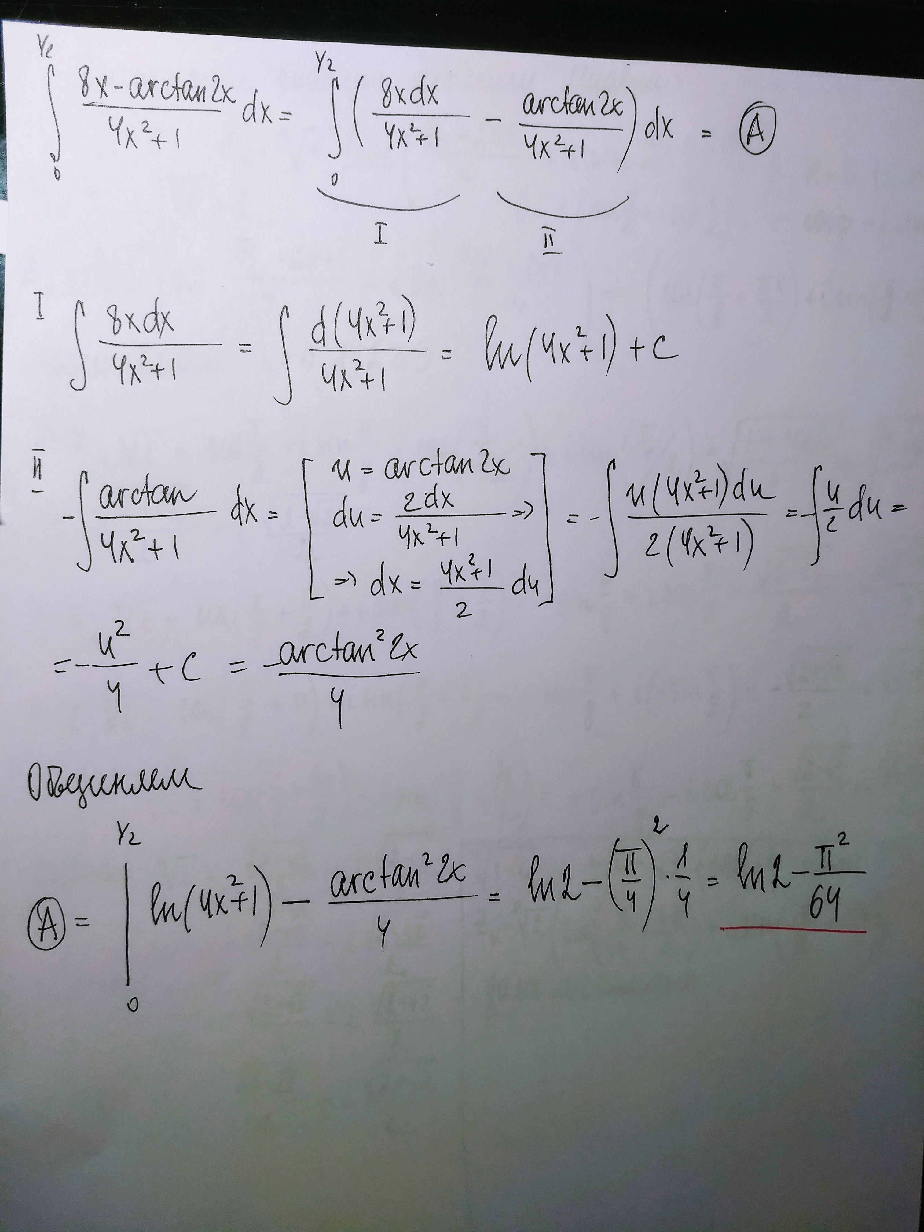 Разбиваем дробь на два интеграла, решаем каждый методом замены переменной.