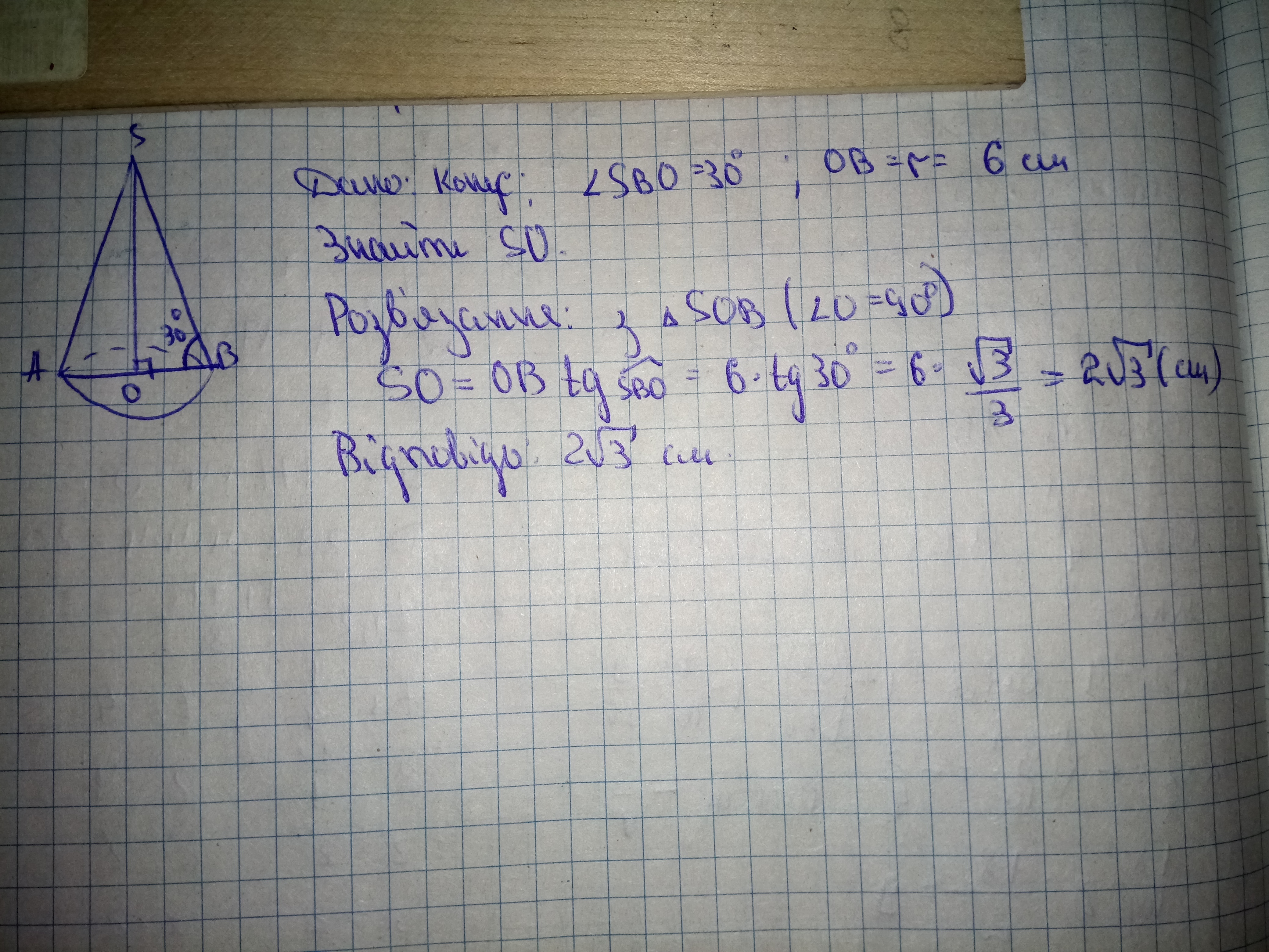 Кут між твірною і площиною основи конуса 30 радіус основи конуса дорівнює 6 см. Знайти висоту конуса.