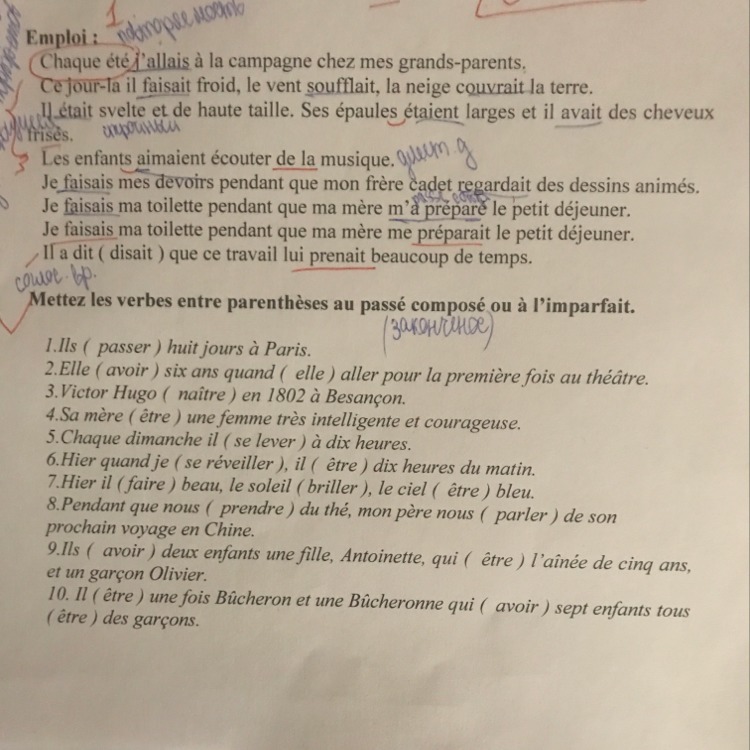 6. Hier quand je me suis réveillé, il était dix heures du matin.7. Hier il faisait beau, le soleil brillait, le ciel était bleu.8. Pendant que nous prenions du thé, mon père nous a parlé de son prochain voyage en Chine.9. Ils avaient deux enfants une fille. Antoinette, qui était l'ainée de cinq ans, et un garçon Olivier.10. Il était une fois un Bucheron et une Bucheronne qui avaient sept enfants tous étaient des garçons.