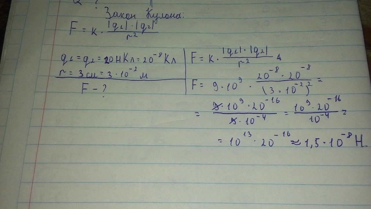 С какой силой взаимодействуют два заряда по 20 нКл, находящиеся на расстоянии 3 см друг от друга?