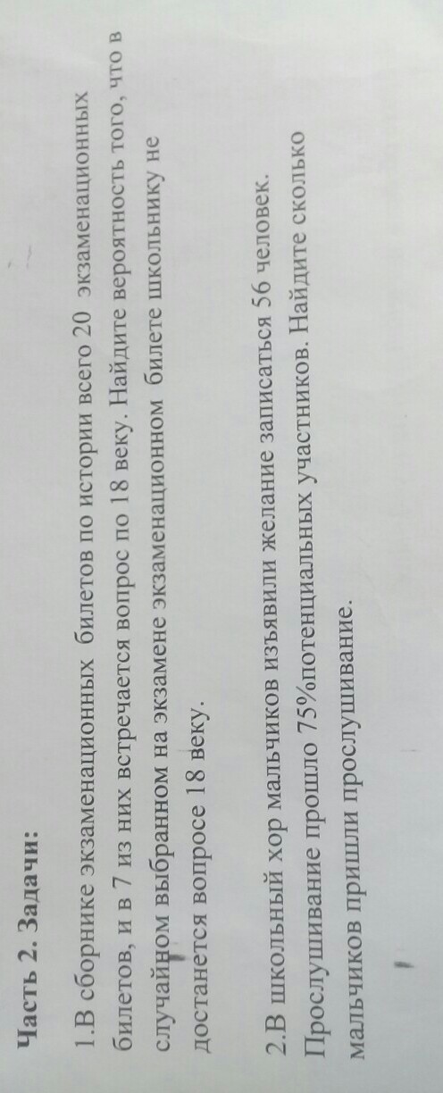 1.Всего 20 билетов, в них 7 по истории 18 века. Из этого следует, что 20-7=13 билетов, в которых нет вопросов о 18 веке. Что бы найти вероятность того, что ему не достанется билет в котором есть 18 век, нужно(желаемое разделить на общее количество) 13:20=0,65