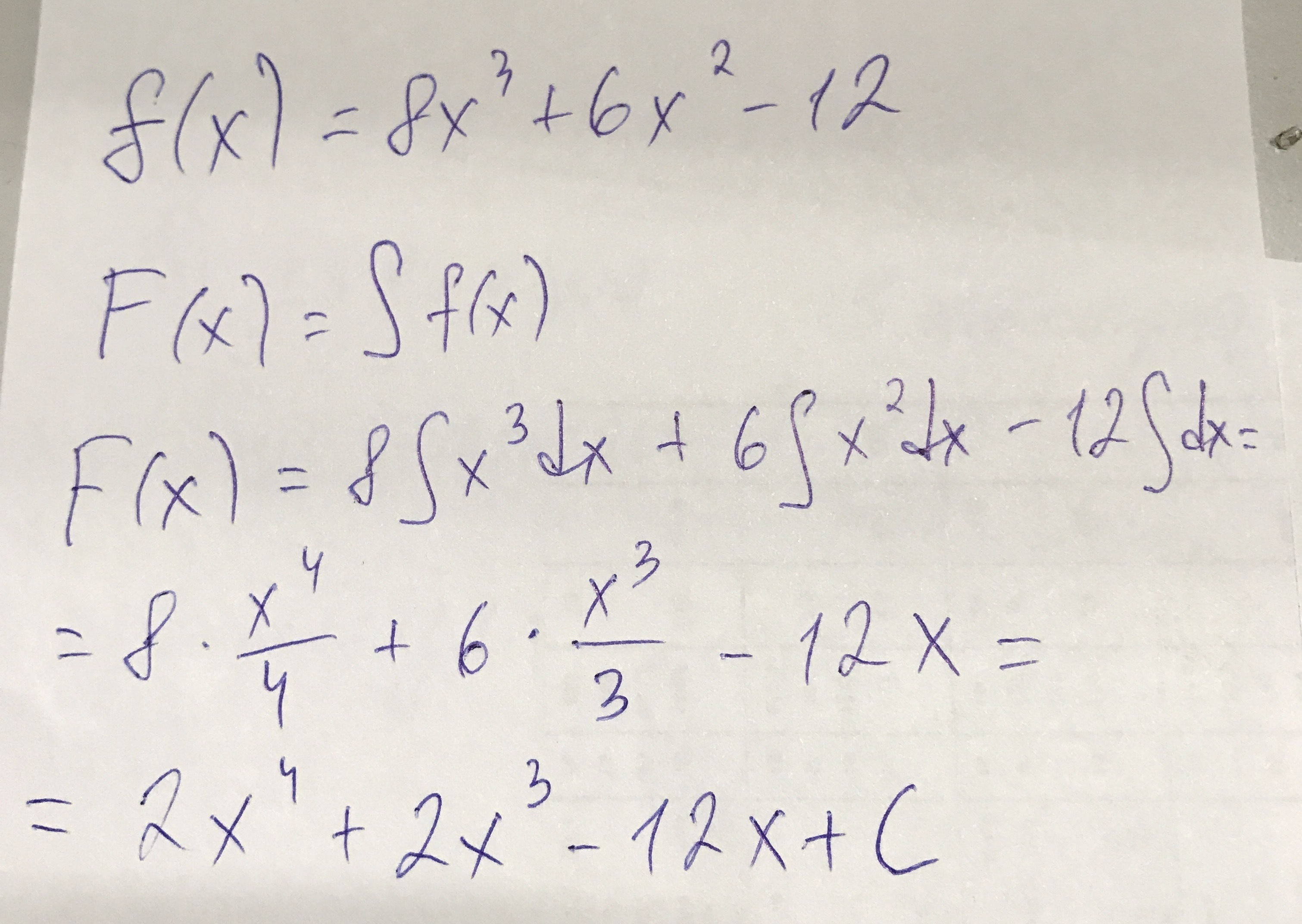 F(x)= 8x^4/4 + 6x^3/3 -12x = 2x^4 +2x^3-12x +C