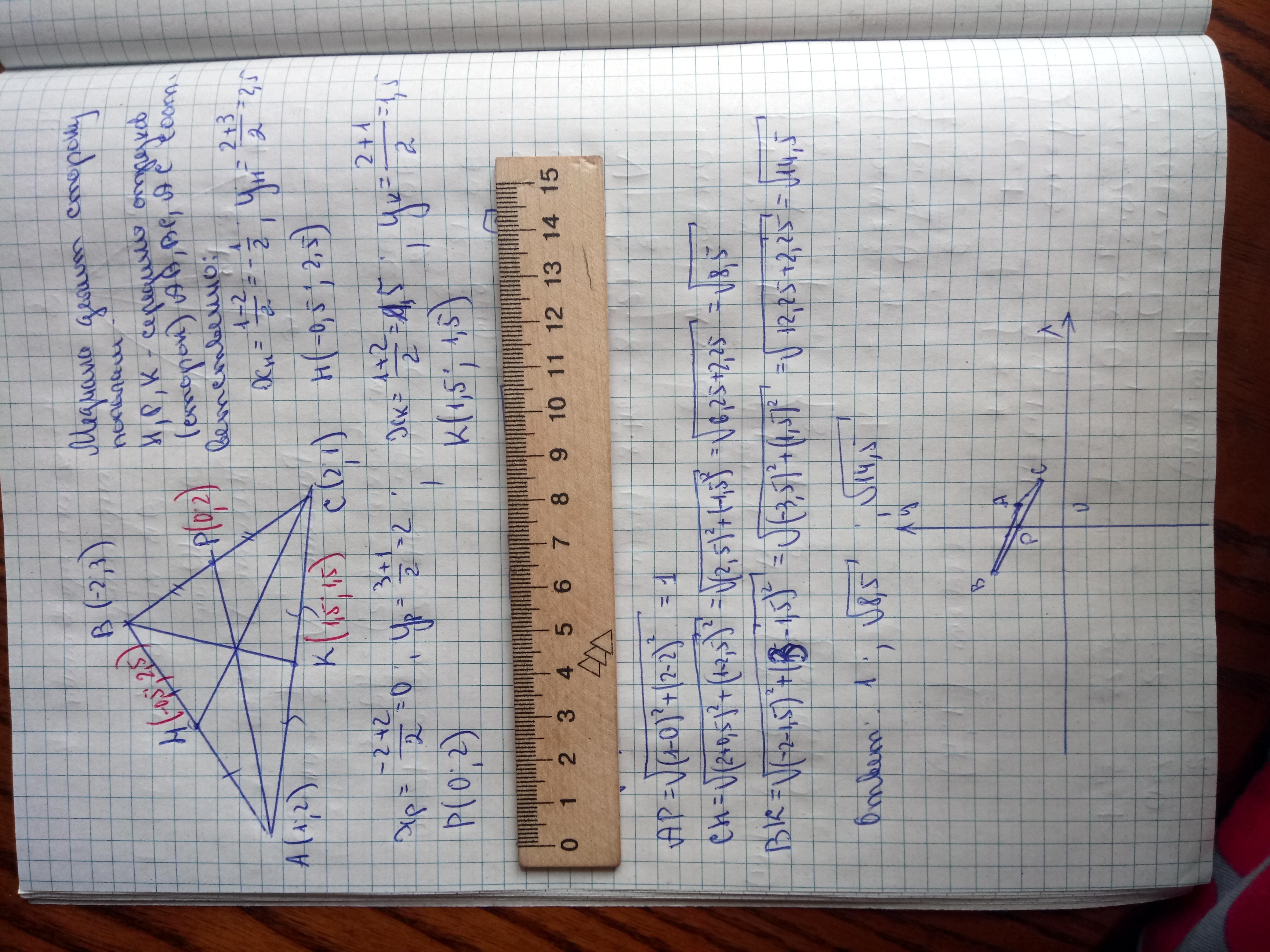 даны точки A(1;2) B(-2;3) C(2;1)которые являются вершинами треугольника ABC.Найдите длины его медиан