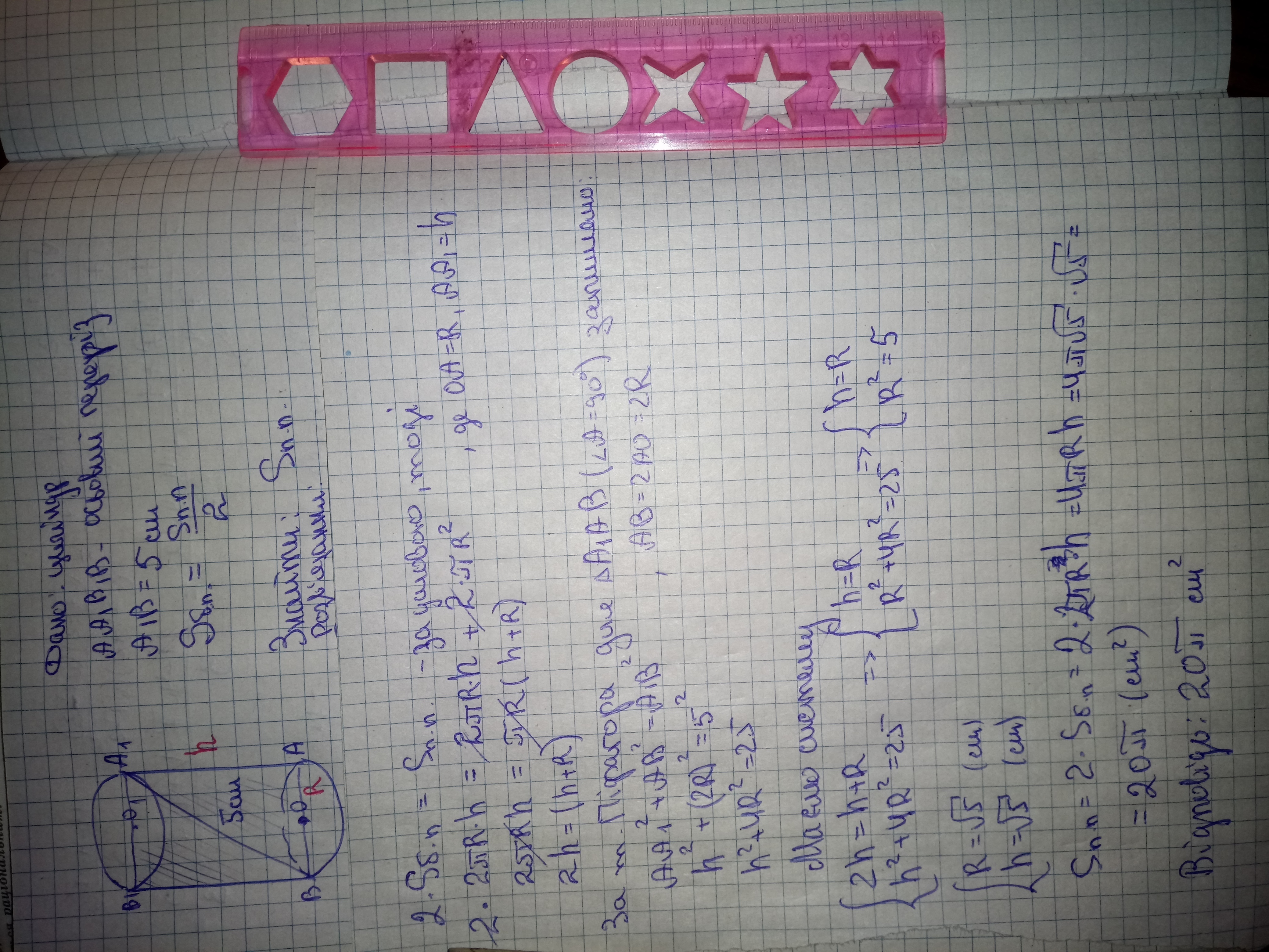 Площа бічної поверхні циліндра дорівнює половині площі його повної поверхні. Знаючи, що діагональ осьового перерізу дорівнює 5 см, знайдіть повну