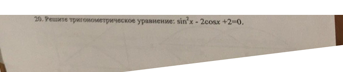 [tex] - cos^{2} (x) - 2 cos(x) + 3 = 0 \ d = 4 + 12 = 16 \ cos(x ) = frac{2 + - 4}{ - 2} \ cos(x) = 1 \ cos(x ) = - 3 \ x = 2Пn, n принадлежит целым числам