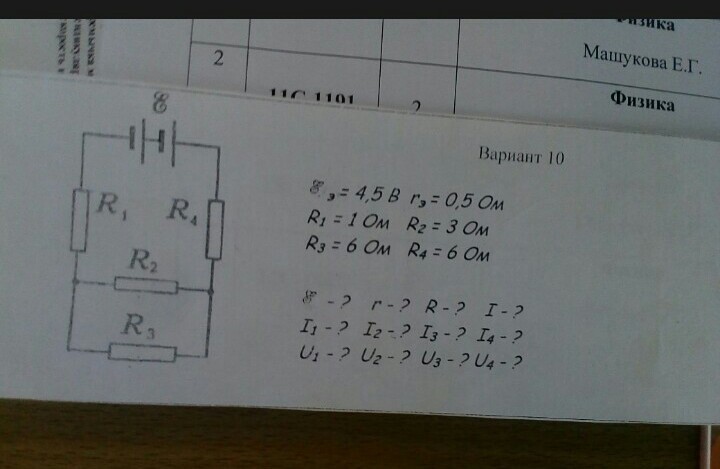 R23=3*6/(3+6)=2 Ом, Rобщ=0.5+6+2+1=9.5 Ом, I=4.5/9.5=0.474 A =R4=R1, U1=0.474*1= 0.474 В, U4=0.474*6=2.84 В, U2=U3= 0.474*2=0.947 В, I2=0.947/3=0.316 А, I3= 0.947/6=0.158 A, Uип=4.5-0.474*0.5=4.263 В