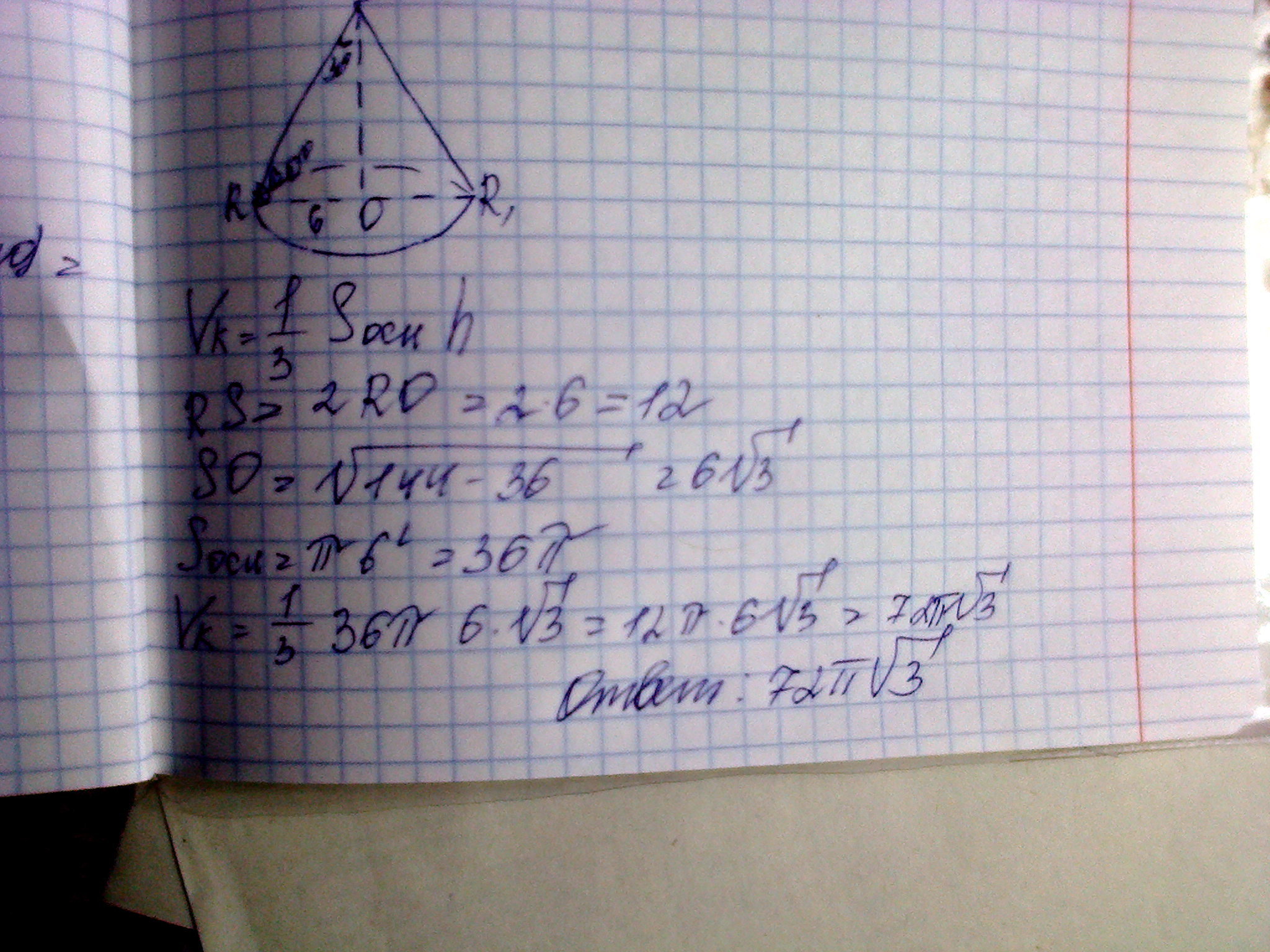 образующая конуса наклонена к плоскости основания под углом 60 градусов, радиус равен 6 см. найдите объем конуса