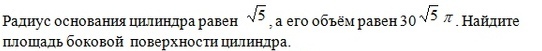 Радиус основания цилиндра равен 5 в квадрате , а его объём равен 30 в степени 5 в квадрате П . Найдите площадь боковой поверхности цилиндра.