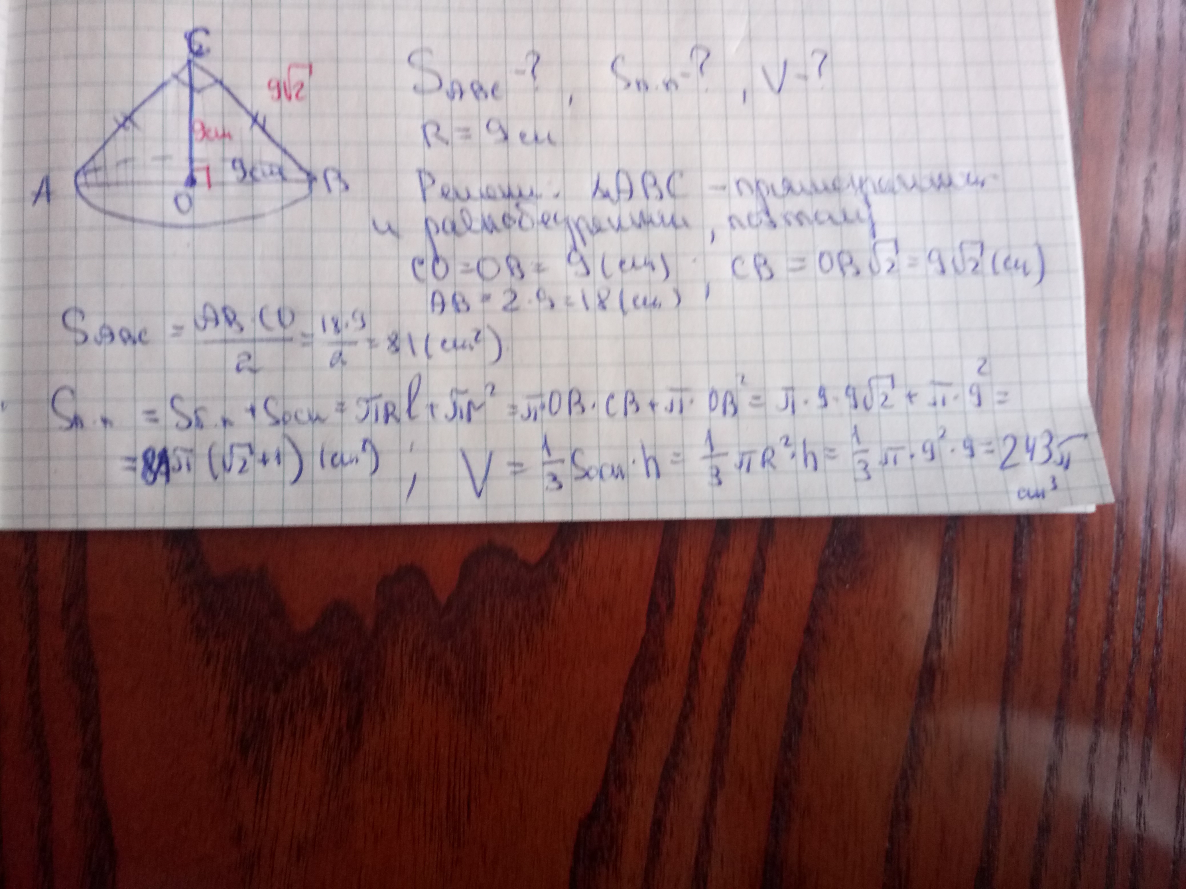Осевое сечение конуса-прямоугольный треугольник.Найдите площадь этого сечения,площадь полной поверхности,объем конуса,если радиус основания конуса равен 9 см