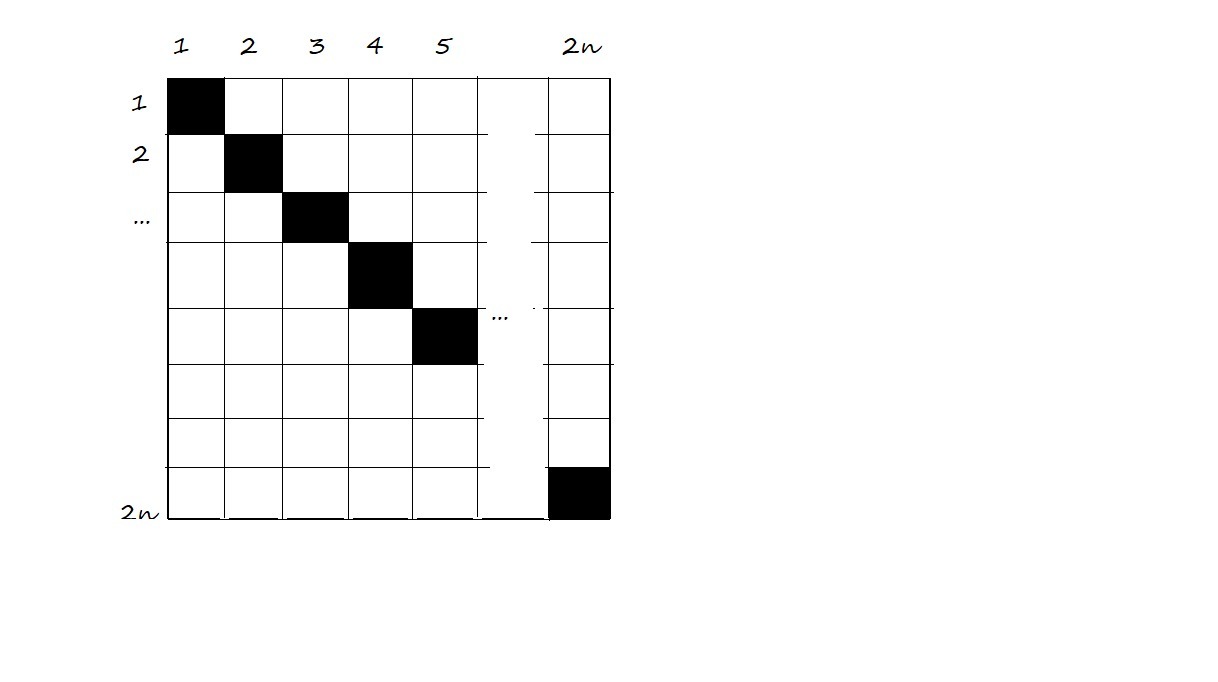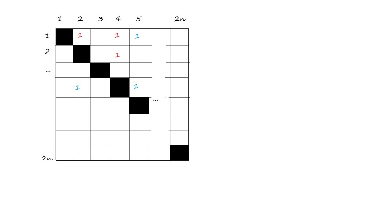 Построим таблицу 2n×2n (см. рис). Столбцы и строки обозначают вершины (они занумерованы числами от 1 до 2n). Если какие-то вершины соединены ребром, то на соответствующем пересечении столбца и строки напишем 1. Например, если вершины 4 и 2 соединены ребром, то на пересечении 4 столбца и 2 строки напишем 1. Поскольку 4 столбец и четвертая строка отвечают за одну и ту же вершину, можем обрезать таблицу пополам (по линии диагонали). Заметим, если три вершины образуют треугольник, то единицы, соответствующие этим соединениям образуют прямоугольный треугольник (если мысленно их соединить в таблице). Также, любой двойке единиц в конкретном столбце соответствует единственная единица в соответствующей строке, такая что они втроем образуют треугольник. Например, на рисунке красные единицы образуют треугольные, а синие - нет. При этом двойке красных единиц в 4-ом столбце соответствует единственная 1-ца, такая, что они вместе образуют треугольник (если бы третья единица была в 3-ем столбце, 1 строке, то треугольник не образовывался). Значит общее число треугольников в графе соответствует сумме комбинаций двоек в каждом столбце. Пусть в первом столбце n₁ единиц, во втором n₂ и т.д. Значит общее число треугольников равно