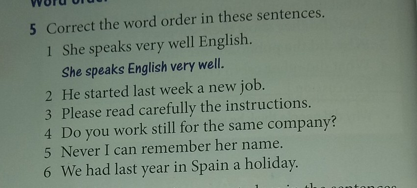 2. He started a new job last week. 3.Please read the instructions carefully. 4.Do you still work for the same company ? 5. I can never remember her name. 6. We had holiday in Spain last week. (могут быть ошибки, я не уверена)