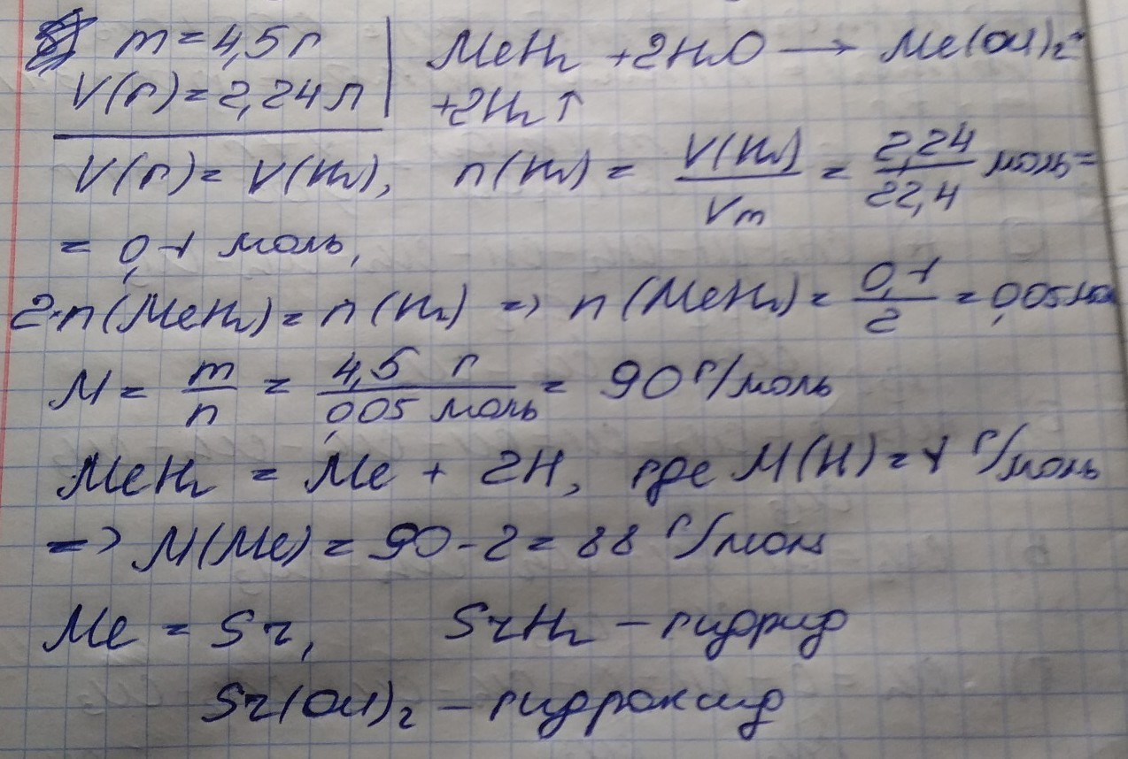 При растворении 4,5 г гидрида щелочноземельного металла в воде выделилось 2,24 л газа (при н.у.). Установите формулы гидрида и продукта его реакции с водой, который остается в растворе.