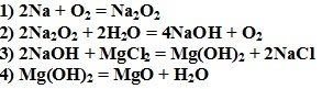 Натрий сожгли на воздухе. Полученное вещество растворили в горячей воде. Во время растворения выделился газ, поддерживающий горение, а к оставшемуся раствору прилили раствор хлорида магния. Образовался белый осадок. Осадок отфильтровали, высушили и сильно прокалили.