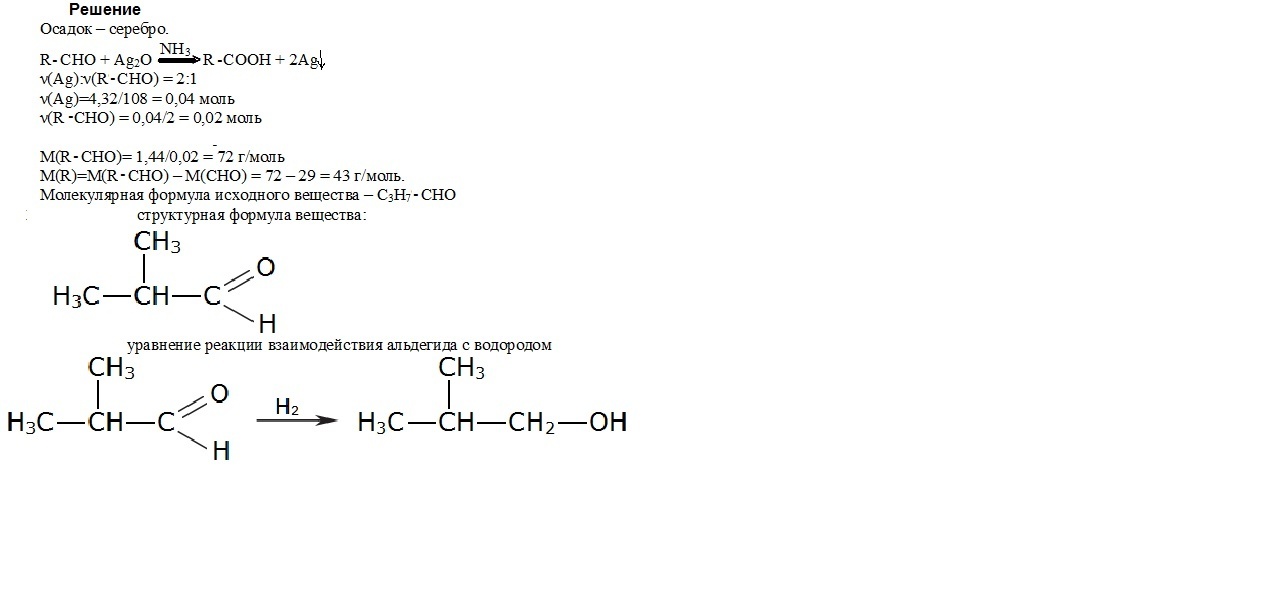 К альдегиду массой 1,44 г прилили избыток аммиачного раствора оксида серебра (I). После реакции выделили 4,32 г осадка. Определите строение альдегида, если известно, что искомый альдегид имеет разветвленный углеводородный радикал, а при его реакции с водородом образуется первичный спирт. На основании этих данных: