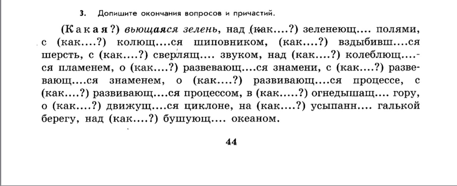 3. (какими?) зеленеющими; (каким?) колющимся; (какая?) вздыбившаяся; (каким?) сверлящим; (каким?) колеблющимся; (каком?) развевающемся; (каком?) развивающемся; (каким?) развивающимся; (какую?) огнедышащую; (каком?) движущемся; (каким?) бушующем.