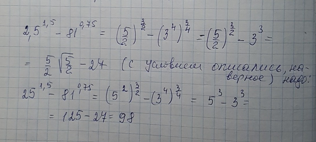 найдите числовое значение выражения: 2,5^1,5-81^0,75