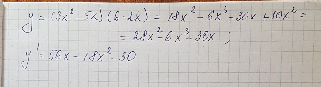 ВЫЧИСЛИТЕ ПРОИЗВОДНУЮ ФУНКЦИИ : y=(3x^2-5x)(6-2x).