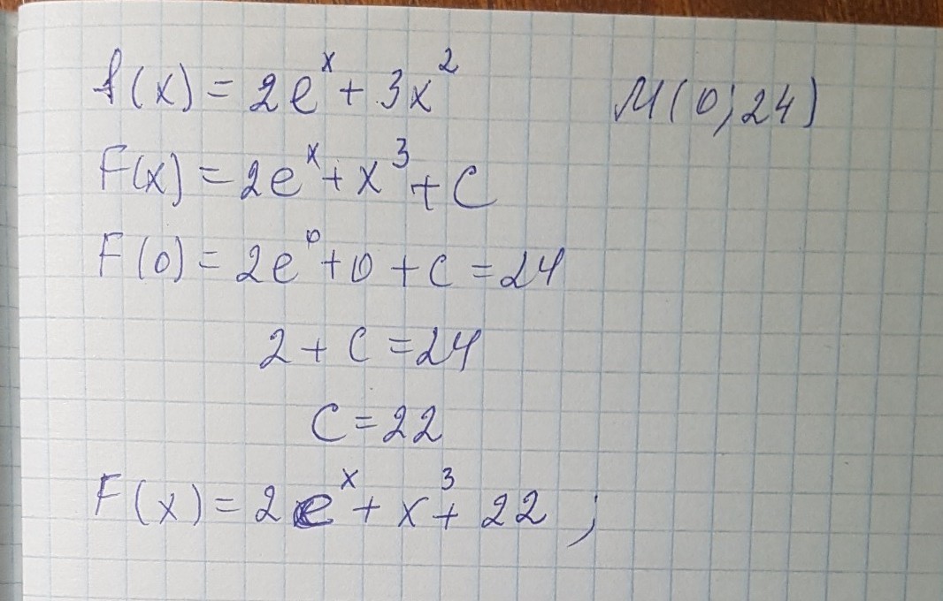 для функции f(x) найти первообразную график которой проходит через точку M(0;24) и f(x)=2e^x+3x^2