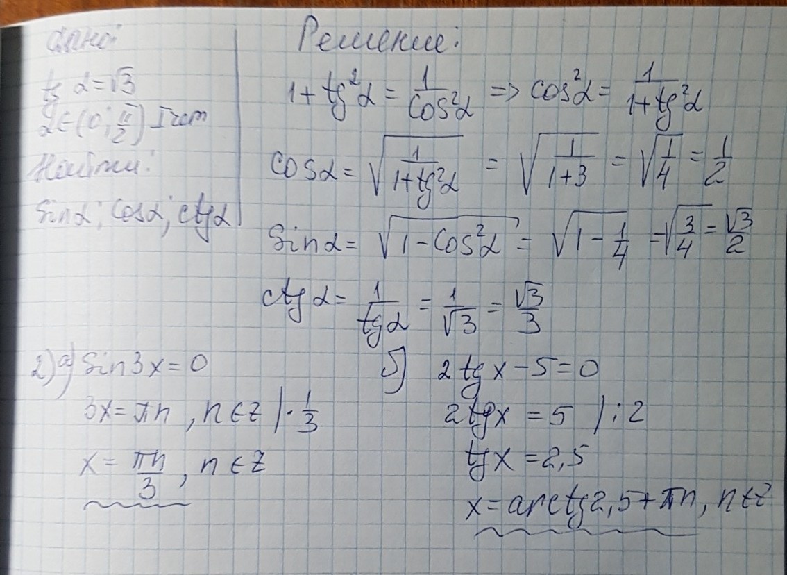 2. Решить уравнения: а)sin 3x=0 б)2tgx-5=0.