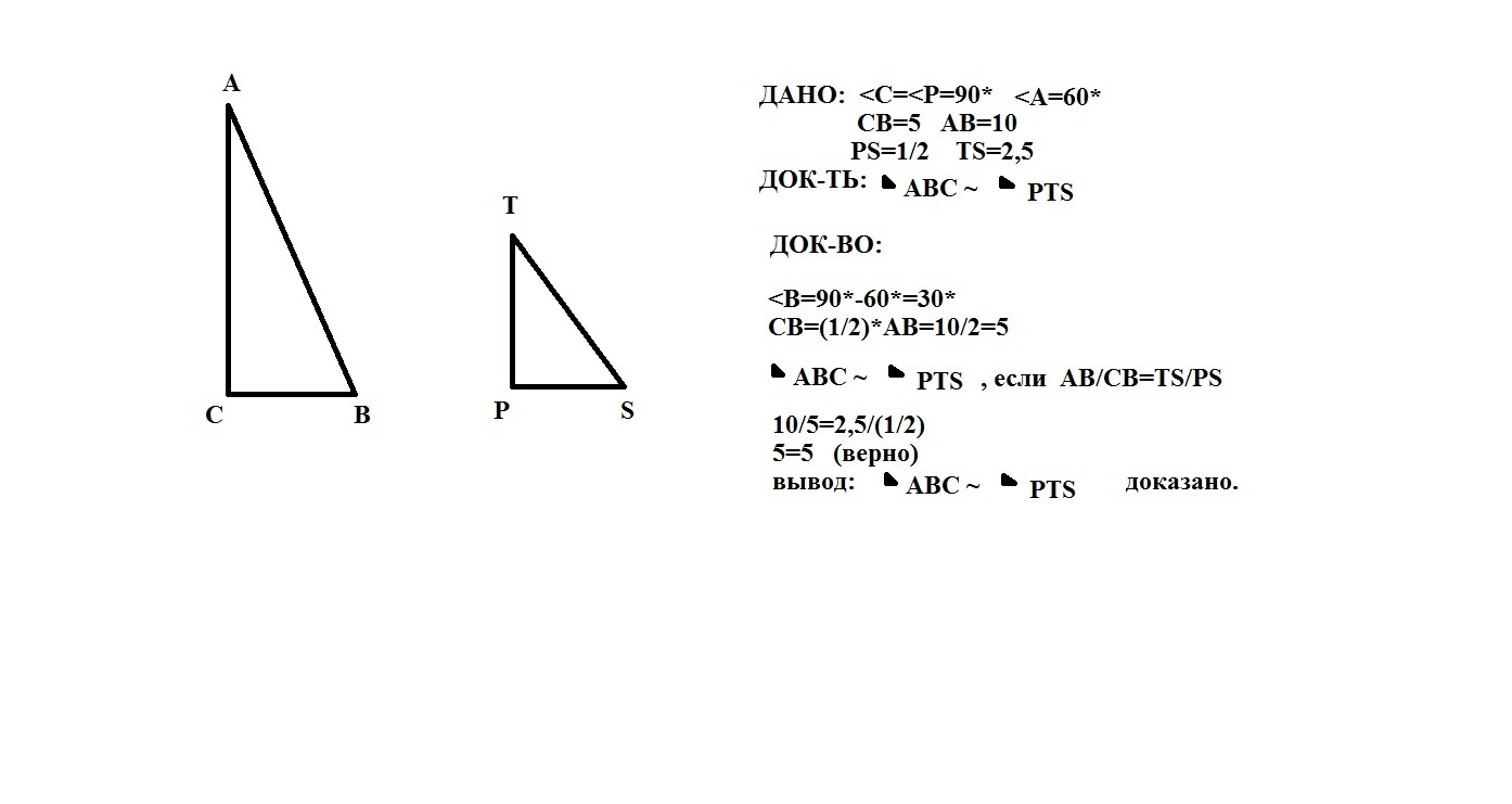 Треугольники ABC и SPT- прямоугольные. <C=<P= 90 Град. < A= 60 гард. SP=1/2 ST. AB= 10 . ST= 2.5 Подобные ли треугольники . если да, то найдите коэффициент подобия