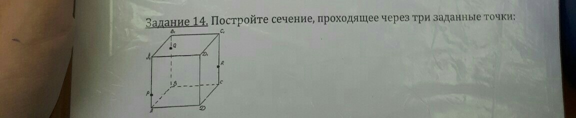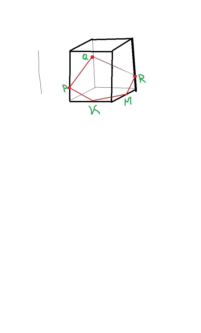Просто соедините точку Q c P , Q c R ; Потом в передней грани через точку P проведите линию параллельну QR (получите точку на AD, напримери К) в правой боковой грани через точку R проведите линию параллельную QP, получите точку на CD (например М). Соедините точку К и М. QPKMR - искомое сечение