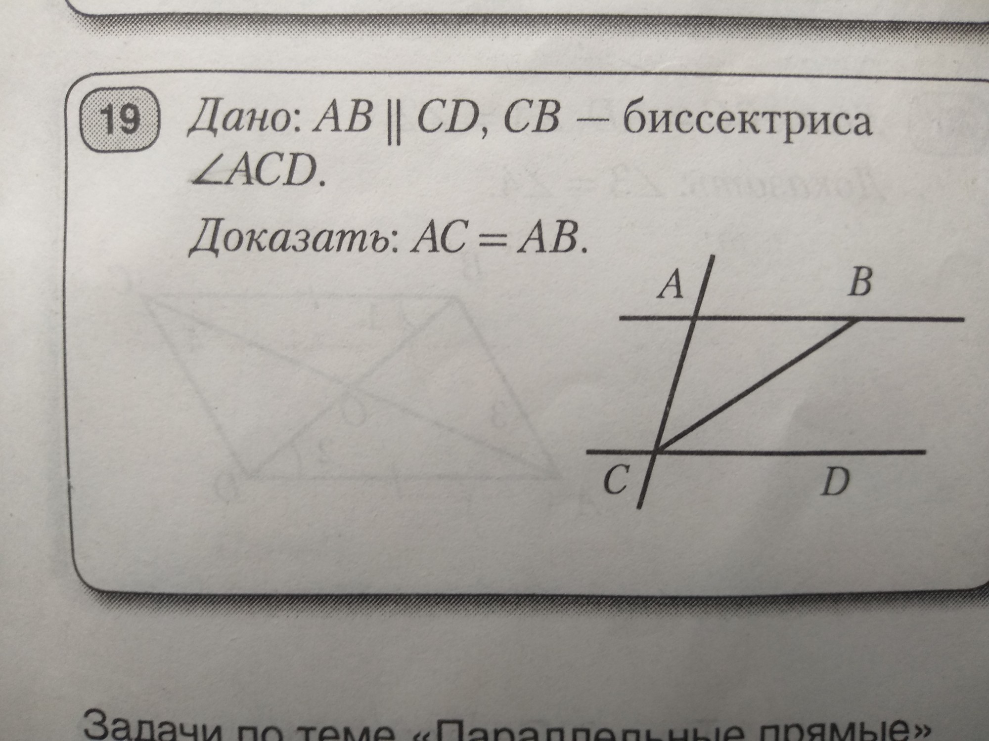 1)Из угла B проведем отрезок BK параллельный отрезку AC тогда , четырехугольник CABK параллелограмм т.к AB параллельна CK (точка К лежит на СД) по условию , CA параллельна BK.