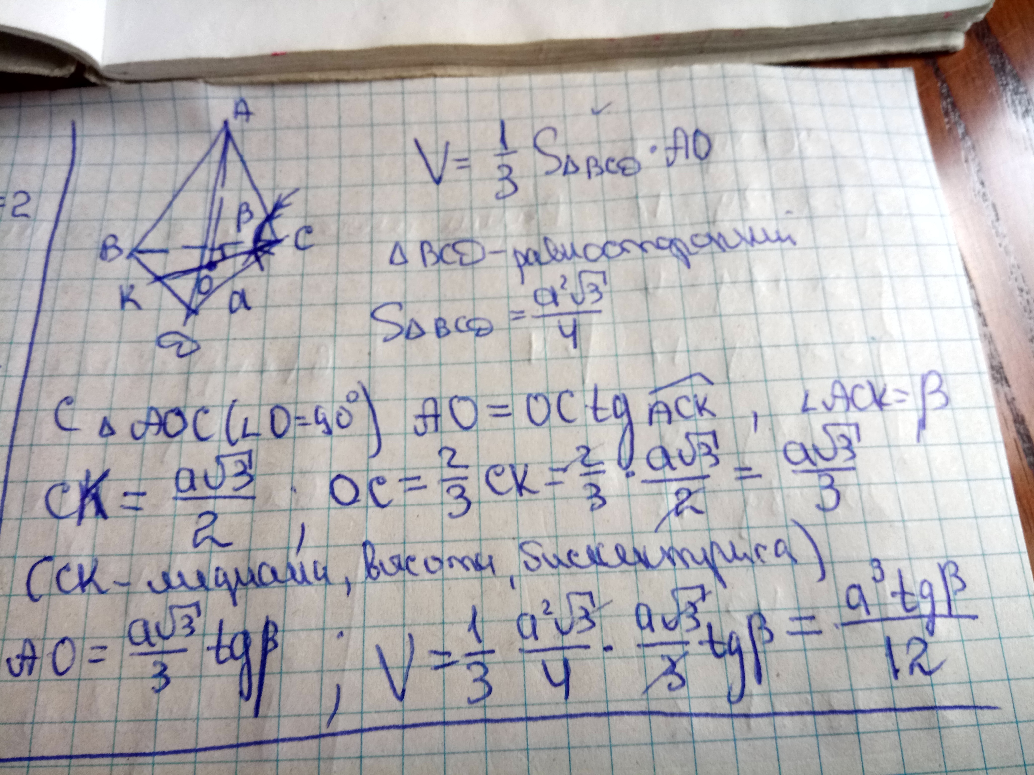Боковые ребра правильной трехугольной пирамиды образуют с плоскостью основания угол бетта.Найти объем,если сторона основания равна "а"