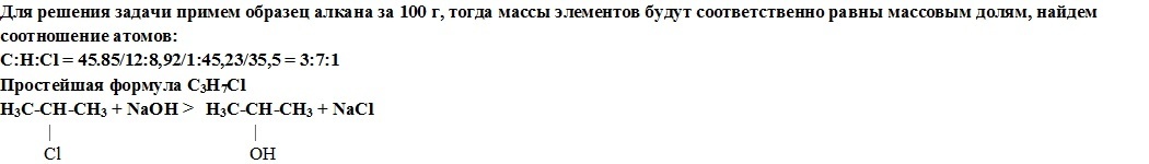 Монохлорпроизводное некоторого алкана содержит 45,85% С, 8,92% Н, 45,23%Cl по массе. Известно, что в реакции этого вещества с водным раствором гидроксида натрия образуется вторичный спирт. На основании этих данных: