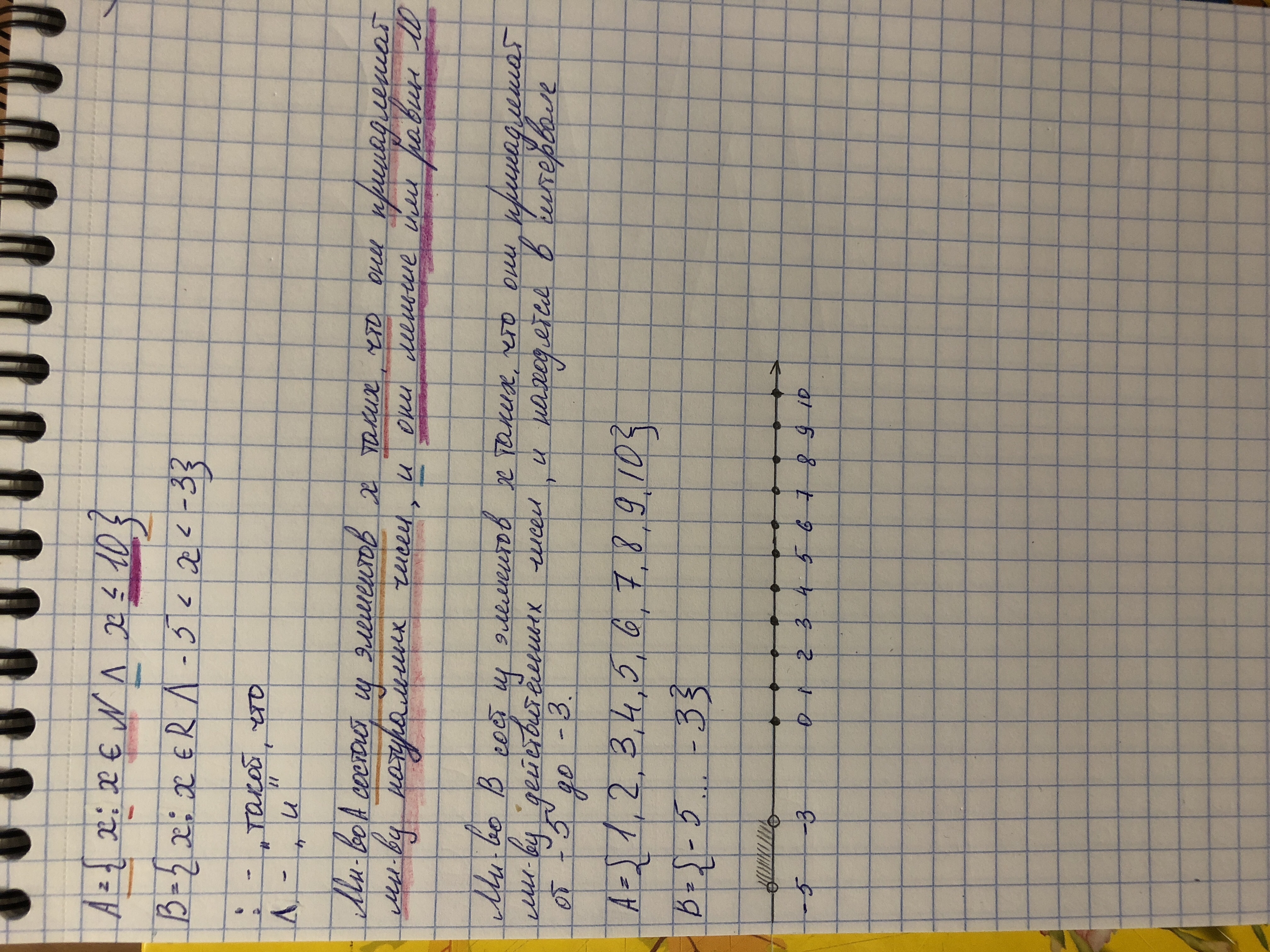 Изобразите на числовой прямой следующие множества: A = { x | x ∈ N ∧ x ≤ 10 }; B = { x | x ∈ R ∧ -5 < x < -3 }.