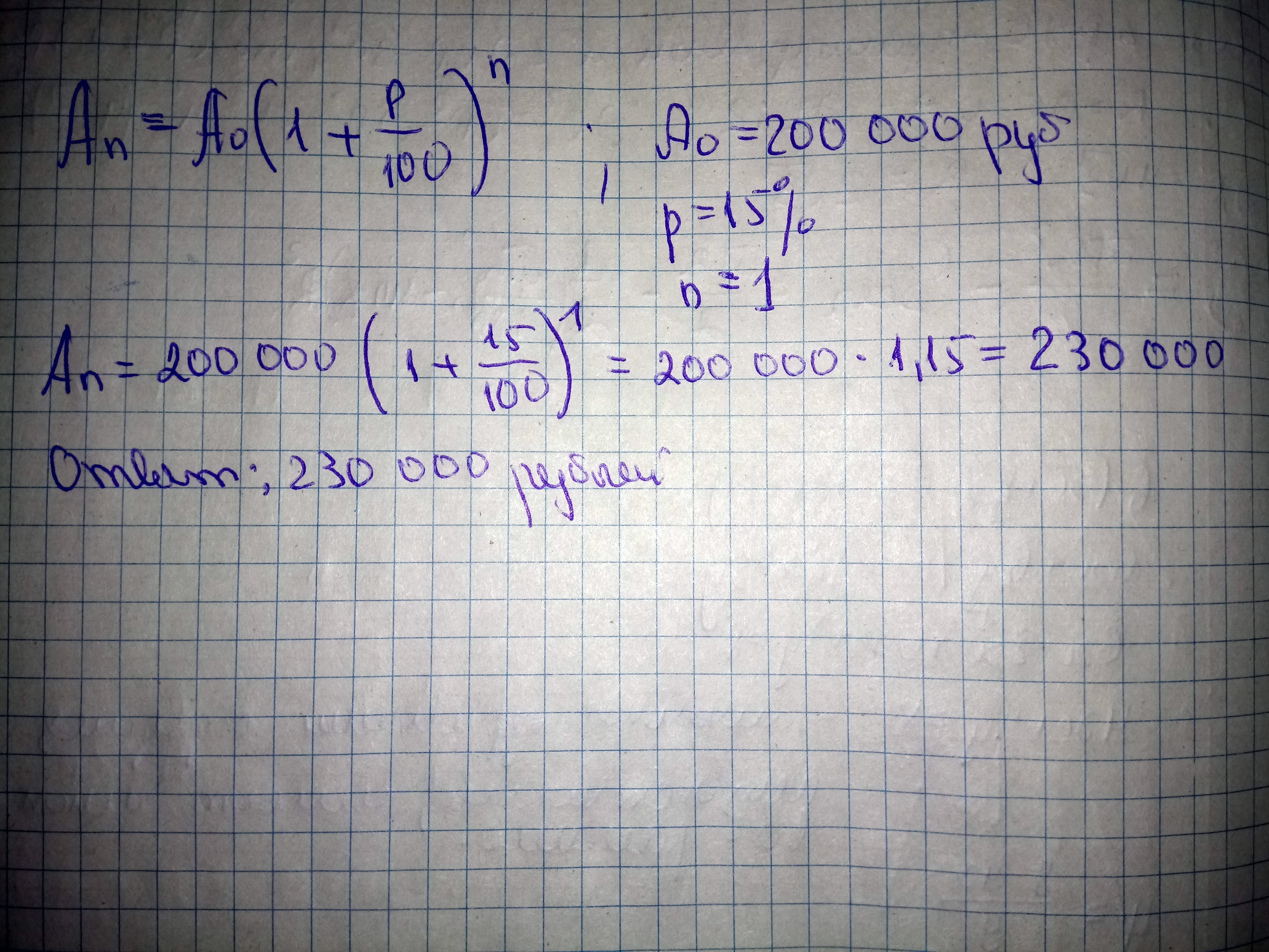 Иван Петрович открыл счёт в банке и положил 200000 рублей под 15% годовых. Определите сумму вклада через год. Ответ укажите в рублях.