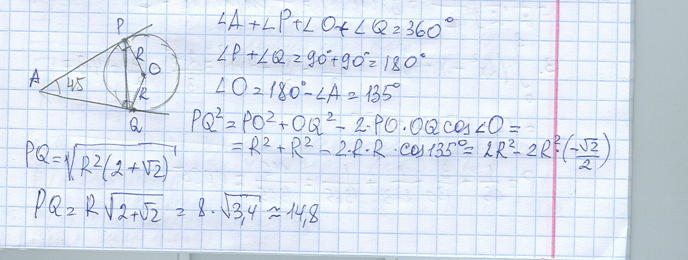 Угол с вершиной A равен 45. Окружность с радиусом 8 касается сторон угла в точках P и Q. Найдите длину отрезка PQ.