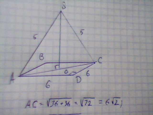 Точка s що не лежить у площині квадрата ABCD віддалена від кожного на 5 см . Строна квадрата дорівнює 6 см . Знайти відстань від точки квадрата