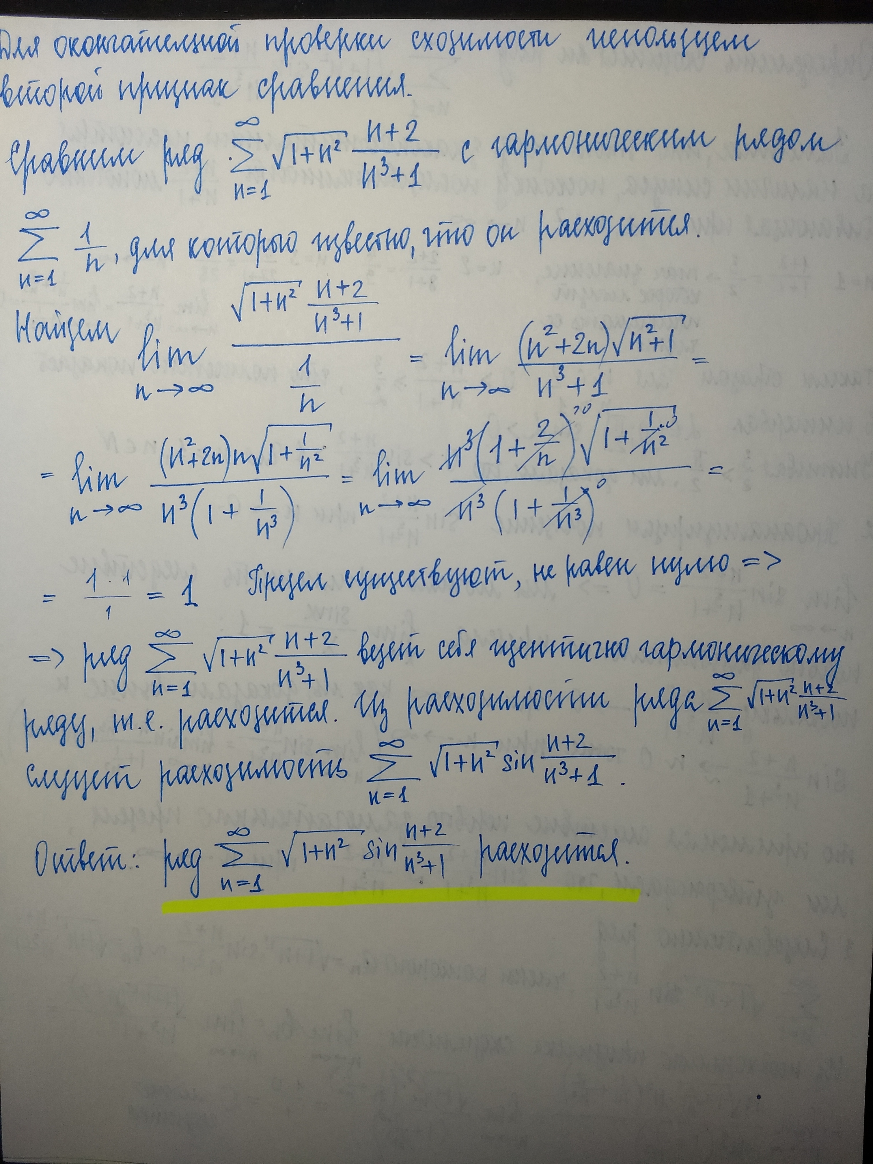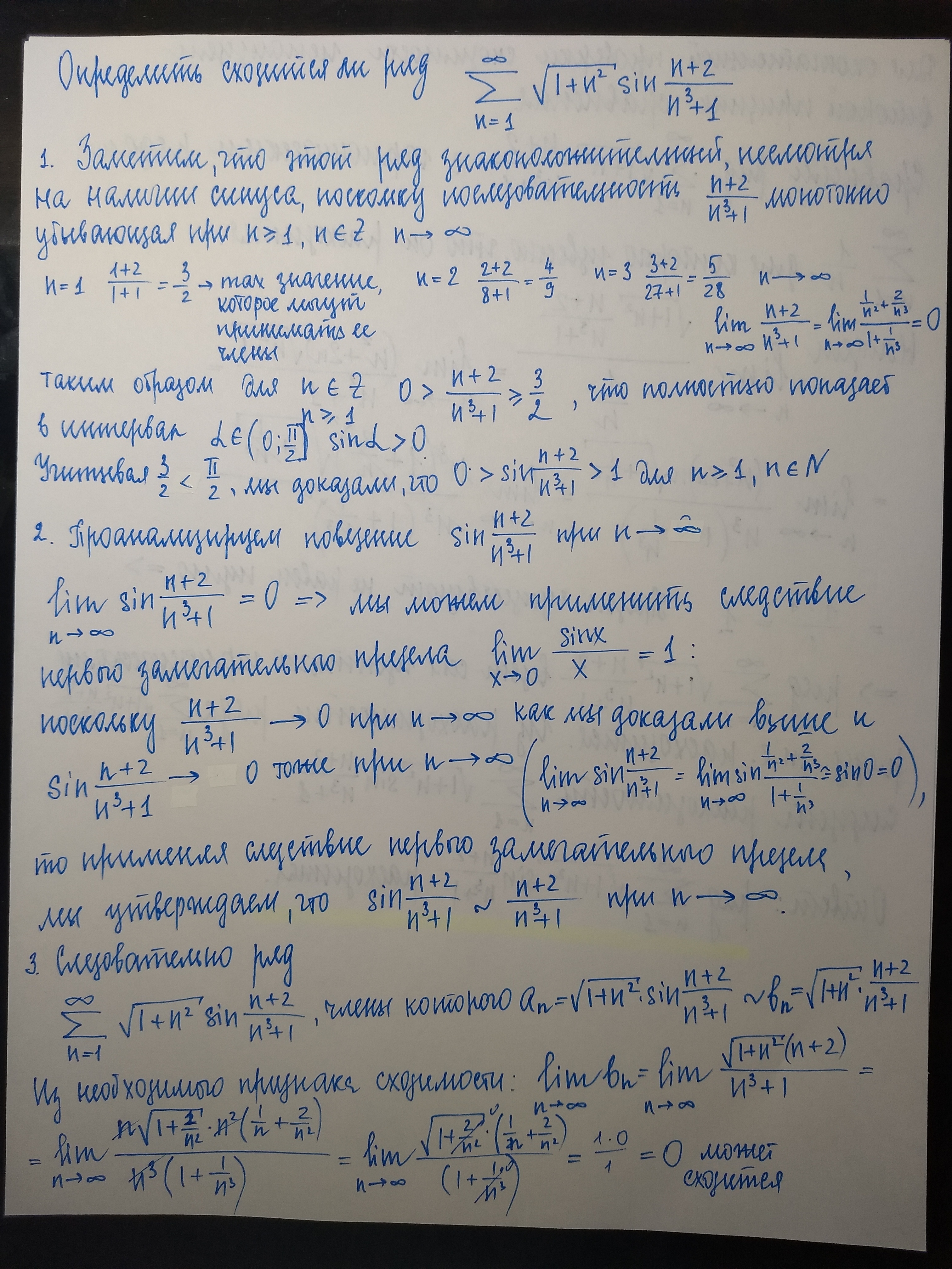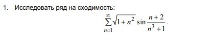 Для исследования сходимости потребуется преобразовать данный ряд к более простому виду, применяя следствие первого замечательного предела. Tricky, tricky! как говорят, вздыхая мои студенты. Надеюсь вам на тесте такой не попадется. Я привел подробное решение с пояснениями. Не стесняйтесь спросить, если появятся вопросы. Удачи вам!