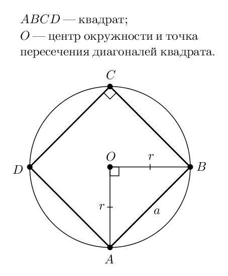 Диагонали квадрата равны, а также в точке пересечения делятся пополам. Следовательно, точка их пересечения O (см. обозначения на рисунке) равноудалена от всех вершин и поэтому является центром описанной окружности. Отрезки OA=OB=r — её радиусы. Рассмотрим Δ AOB. Диагонали квадрата, как и любого ромба, перпендикулярны, поэтому ∠AOB = 90°, а значит, Δ AOB — прямоугольный.