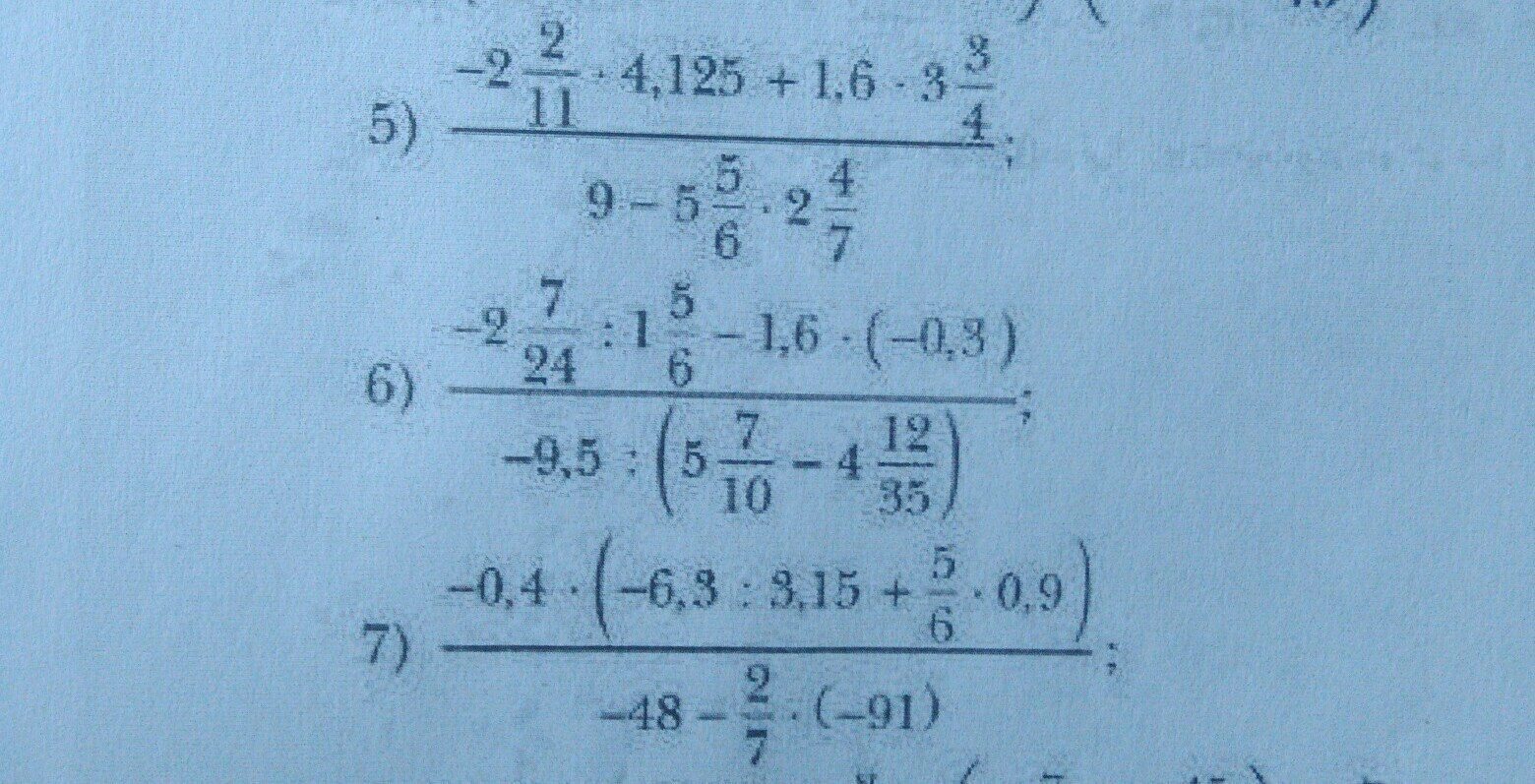 6) = (-55/24 : 11/6 - 1.6*(-0.3) )/ (-9.5 : (57/10 - 152/35) = (далее: нужно привести дроби к общему знаменателю (57*35 = 1995, 152*10 = 1520, их общий знаменатель 350), а при делении: дробь, на которую мы хотим поделить число, переворачиваем и умножаем) = (-55/24 *6/11 -0.48) / (-9.5 : (475/350) = (-5/4 +0.48)/ (-9.5* 350/475) = (-54 = -1.25, при умножении обычно дроби на десятичную, для удобства можно привести десятичную к виду, например: 9.5 = 9 целых 5/10 ) = (-1.25+0.48) / -7 = -0.77/-7 =0.11