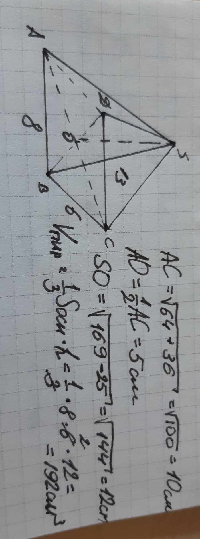 Основанием пирамиды служит прямоугольник, длины сторон которого 8 и 6 см, а боковые ребра равны 13 см. Найдите объем пирамиды