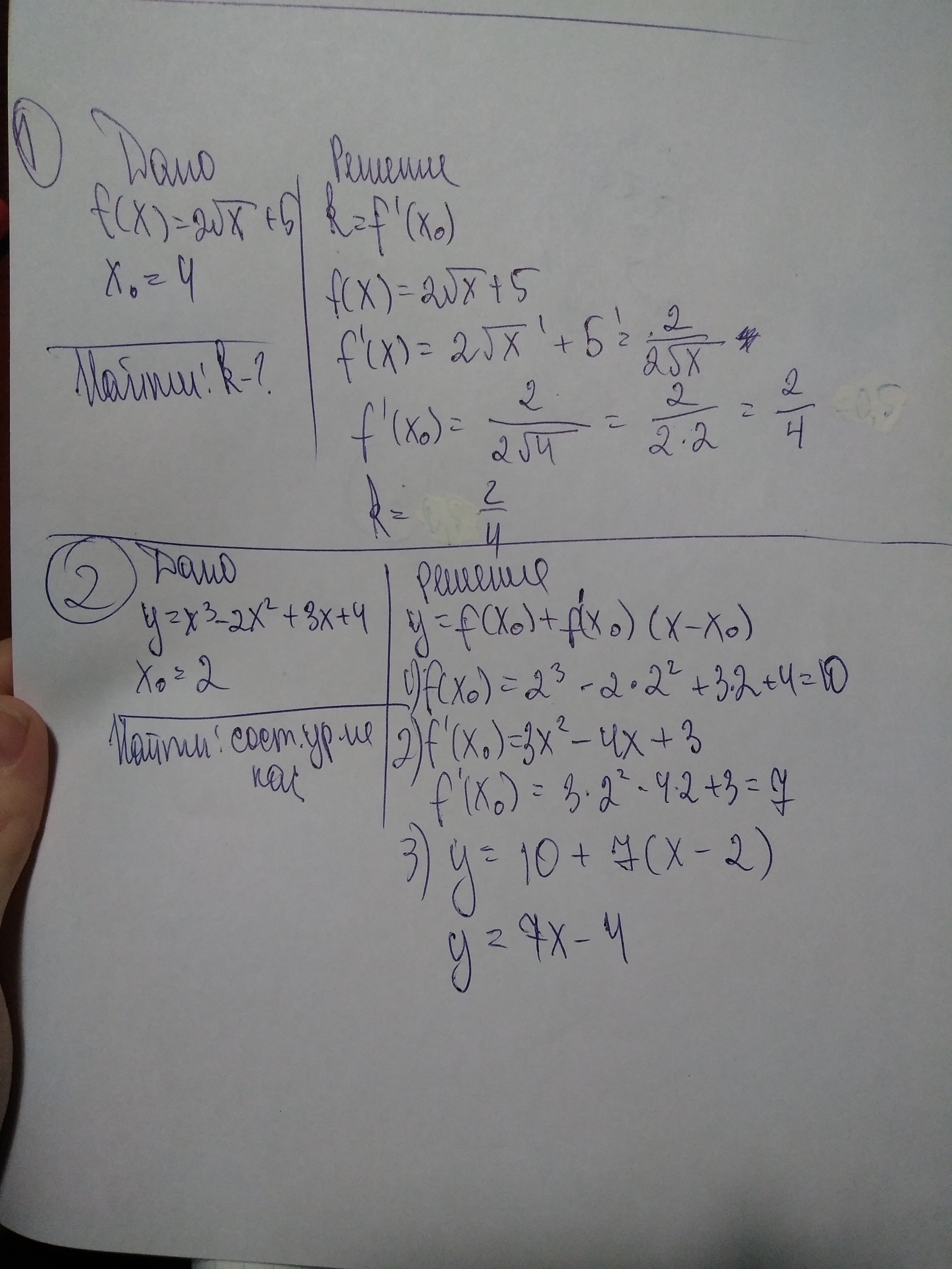 1. Задание 2. Найдите угловой коэффициент касательной, проведённой к графику функции y=f(x) в точке с абсциссой x0=a, если f(x)=2√x+5, a=4