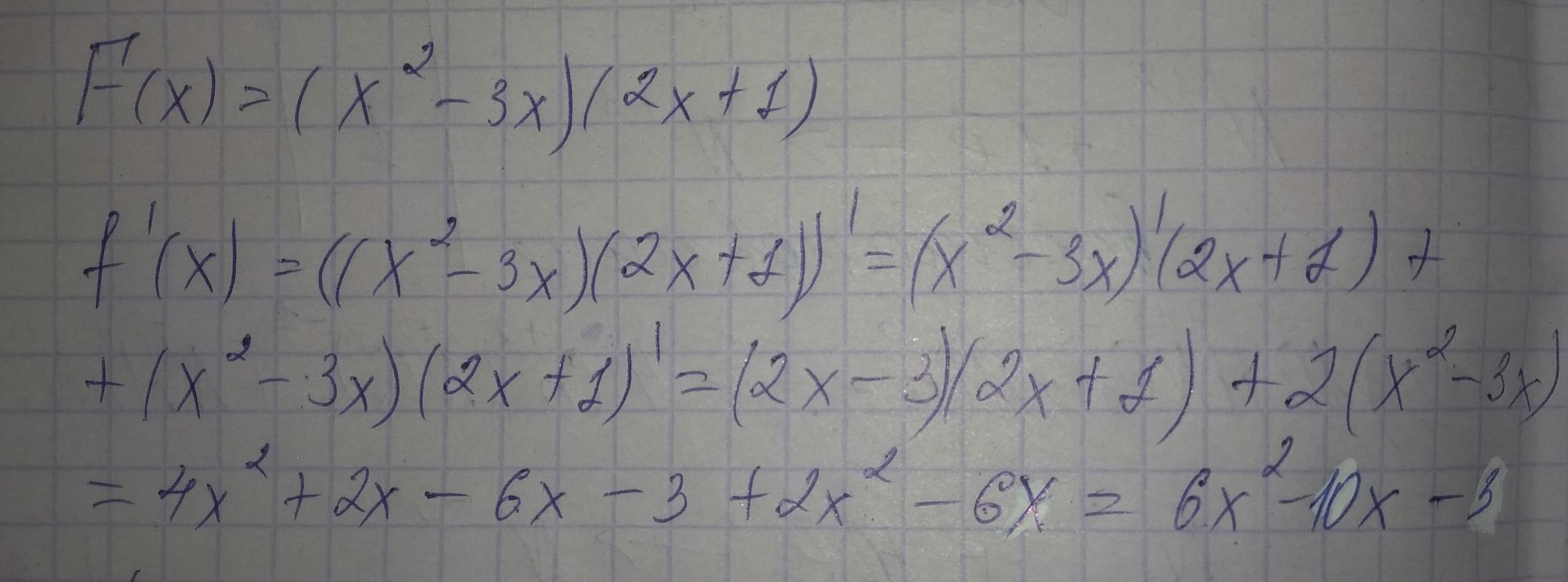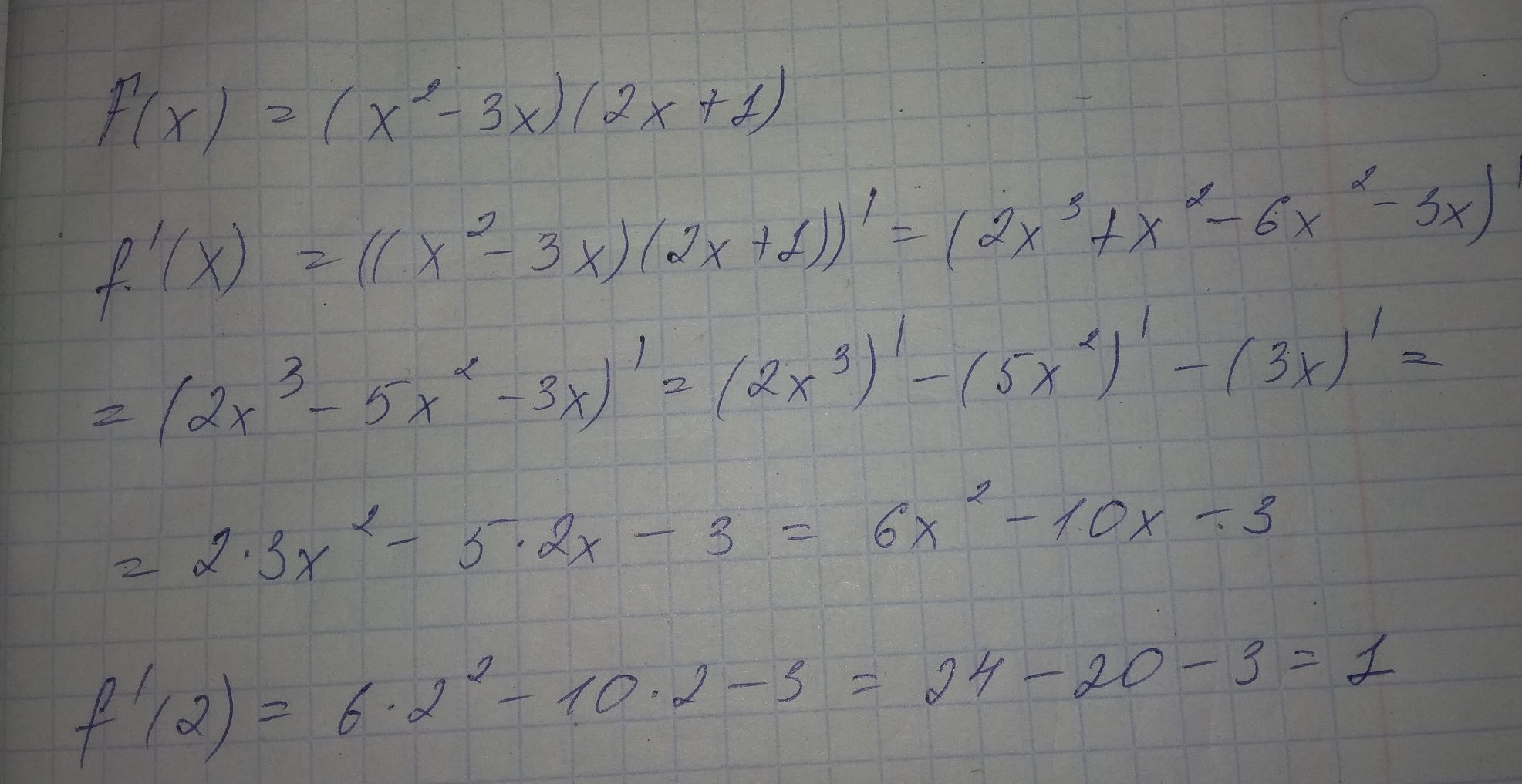 10-11 класс!Помогите решить:F (x)=(X^2-3x)*(2x+1) и вычислить f`(2)!В ответе должен получить -27!Срочно помогите плиз
