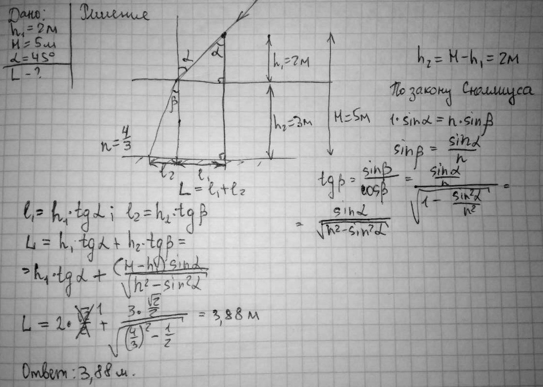 В дно реки вбита свая, выступающая из воды на высоту 2 м. Глубина реки – 5 м. Найти длину тени от сваи на дне реки при условии, что световые лучи падают на поверхность воды под углом 450.
