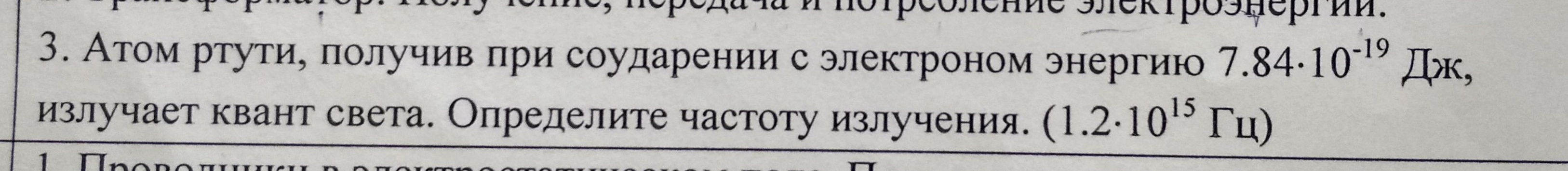 При соударении атом получил энергию E=7.84*10^-19. Для нахождения частоты излучения воспользуемся формулой энергии фотона E=hv, где h- постоянная Планка