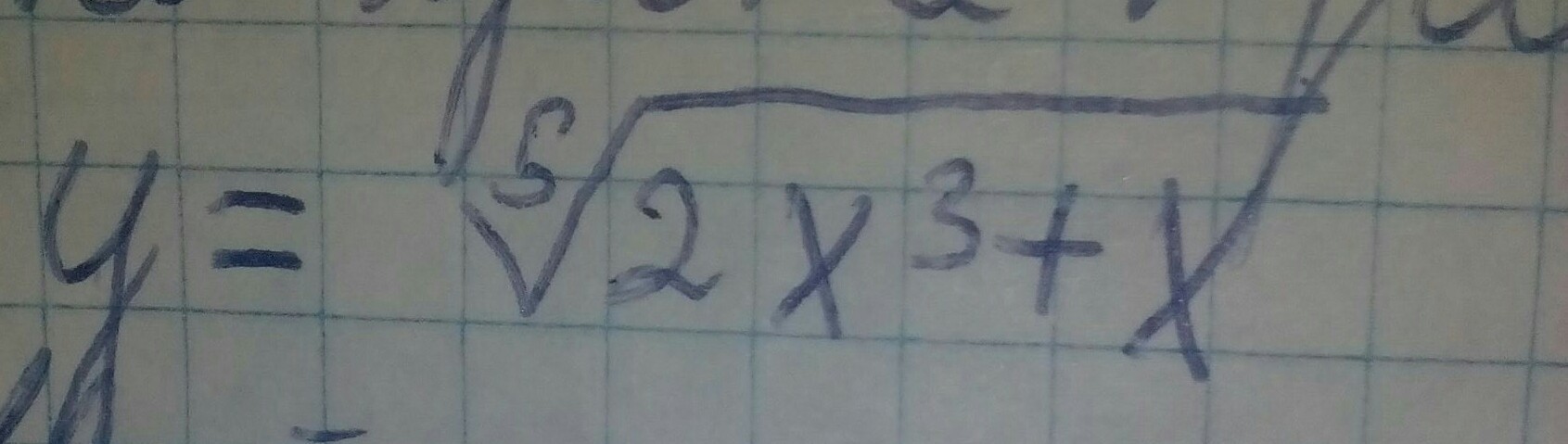 y`=(1/5)*(2x^3+x)^(1/5-1)*(6x^2+1)=0.2(6x^2+1)/(2x^3+x)^0.8