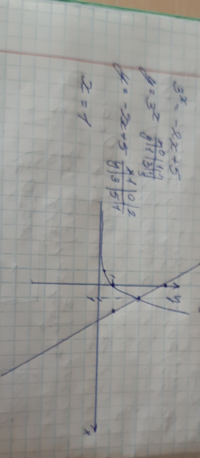 Решить графически уравнение: 3 в степени х = -2х + 5