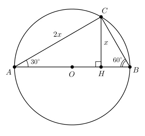 Угол ∠ACB равен 90°, поскольку опирается на диаметр окружности. Поэтому ∠ABC = 180°–(90°+30°)=180°–120°=60°.