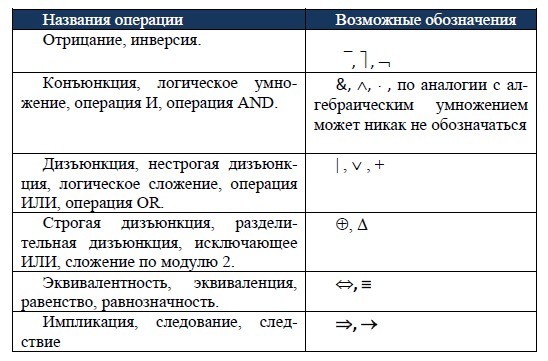 11. Логические операции: конъюнкция, дизъюнкция, инверсия, импликация, эквиваленция: определение операции, обозначение операции, пример построения таблицы истинности для операции.