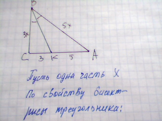 Знайдіть площу прямокутного трикутника, якщо бісектриса його кута ділить протилежний катет на відрізки завдовжки 3 см і 5 см.