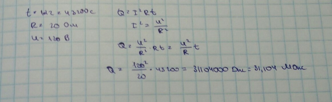 Определите расход энергии за 12 часов работы электрической лампы, если сопротивление лампы 20 Ом, напряжение цепи 120 В